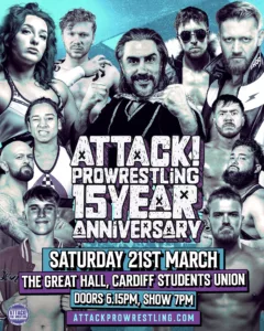 Celebrado el 21 de marzo desde el Great Hall de Cardiff (Gales), ATTACK! Pro Wrestling 15 Year Anniversary presentó ocho combates.