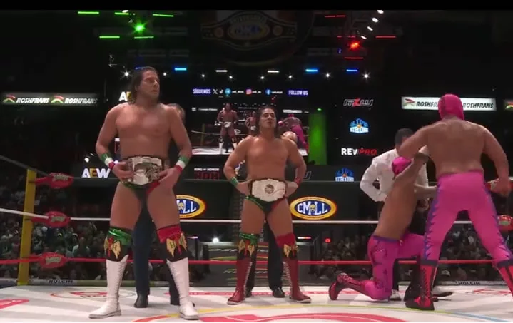La respuesta de los monarcas no tardó: Ángel de Oro aplicó media rana y súplex alemán de forma simultánea, mientras Niebla Roja sometía a ambos rivales con un Gori Special y una campana. La intensidad se elevó con una ráfaga de Canadian Destroyers y moonsaults que arrancaron cuentas cercanas a tres, pero sin concretar el triunfo.