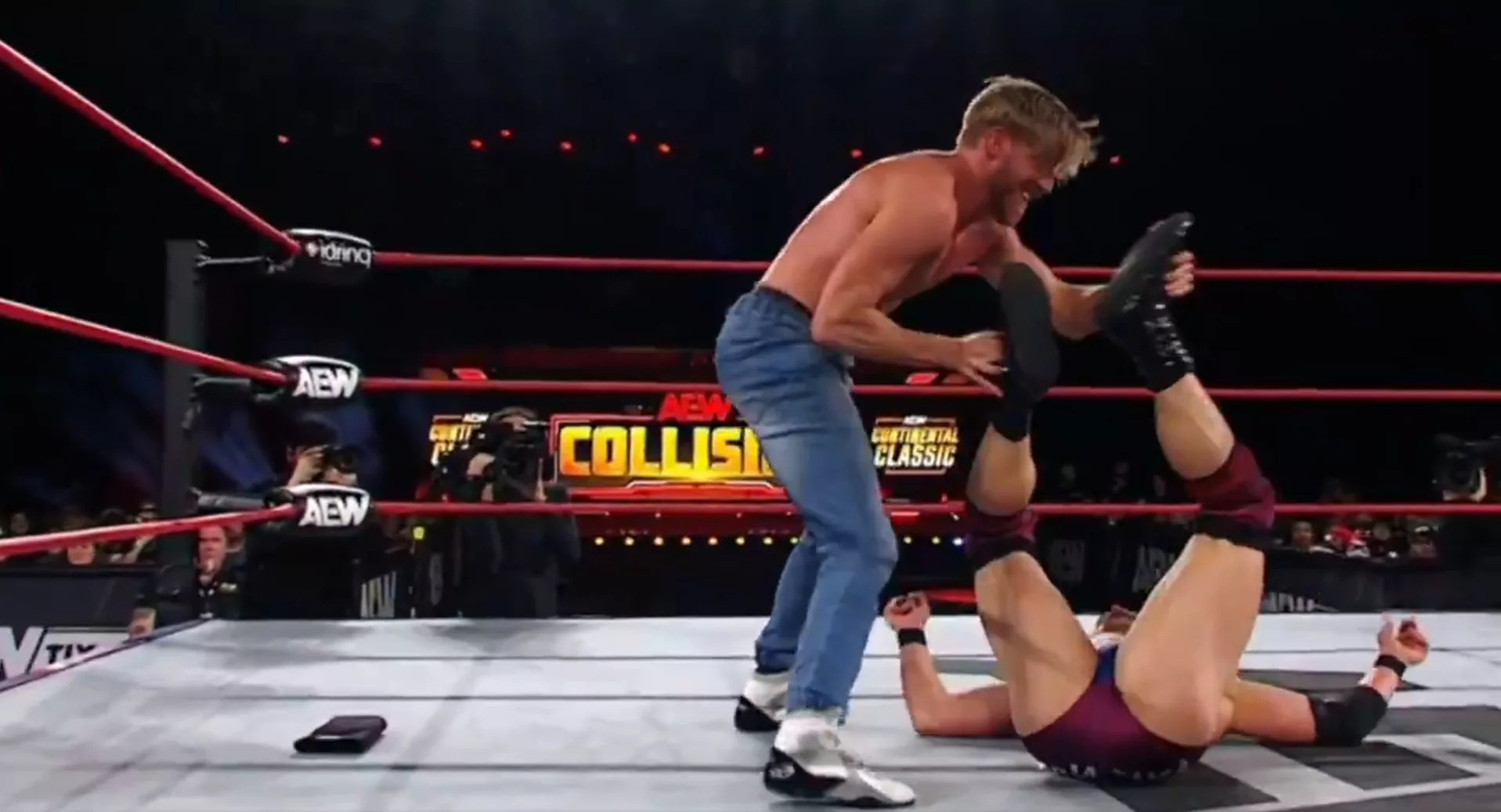 La primera lucha fue de los perdedores de la primera ronda del torneo Continental Classic 2025, Liga Azul. Y aunque son compañeros en The Conglomeration y buenos amigos, ambos lucharon con fortaleza, con intensidad, aunque no tanto como la cruel, sangrienta y dura batalla que nos regalaron Jon Moxley y Claudio Castagnoli, de The Death Riders. Aunque, eso sí, hay antes de la lucha hubo tensión, pues Strong insiste en que él no es parte de The Conglomeration y por eso no iba a satisfacer a Cassidy, quien le pidió que en esta lucha no hubiera machetazos al pecho. Pero, los hubo, ya que Strong dijo que estaba muy enfocado no solo en ganar esta lucha ante Cassidy, sino todo el torneo. Ambos midieron fuerzas, Strong lanzó su machetazo y casi lo conecta, lo cual irritó y enojó mucho a Cassidy, quien luego no tuvo reacción ninguna ante varios machetazos propinados en el esquinero. Strong luego rompió una dormilona al cuello y le dio un rodillazo a la espalda, pero Cassidy con una rodada a espaldas tipo Crucifix Pin logró una cuenta rápida en dos segundos. Storng se recuperó de una dormilona a la cabeza y arrojó a su rival duro contra la barricada. Luego, lo remató con otro raquetazo. Strong buscó su remate, el End of Heartache, pero Cassidy lo sorprendió.