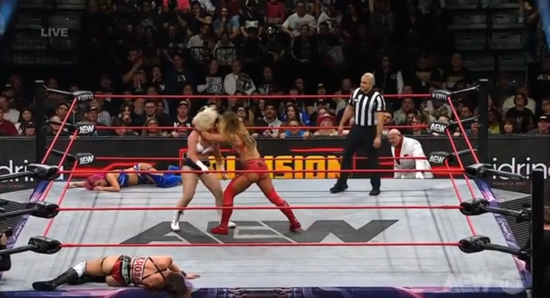 Esta lucha no estaba formalmente anunciada, pero resultó bastante genial... Recordemos que Lena Kross debutó hace unas semanas en AEW y se alineó rápidamente con Bayne y Penélope Ford... Shiarakawa y Bayne empezaron la lucha, Bayne fue enviada contra las sogas, pero intentó un súplex, sin embargo, fue derribada con tacleada de hombro... Kross y Bayne le hicieron ataque en equipo a Storm y a Shirakawa con azotones contra la lona... Kross pateó a Shirakawa en el abdomen, Bayne luego le dio un raquetazo al pecho... Más adelante, Bayne golpeó a Luther, Storm y Shirakawa con un tremendo tope suicida... Más adelante, Bayne atacó a sus dos rivales con un azotón contra la lona y zambullida samoana, y volvieron a volar sobre sus rivales... Luego, Storm y Shirakawa reaccionaron con un doble súplex sobre Bayne y Kross... Kross luego atacó a Shirakawa con un sentón bombazo... Marina Shafir apareció y bajó a Storm del esquinero, evitando la movida y atacándola con su Mother's Milk... Marina metió a Toni debajo del ring... Shirakawa quedó sola en el ring y Lena Kross la remató con tremendo Jackhammer estilo Goldberg para ganar.