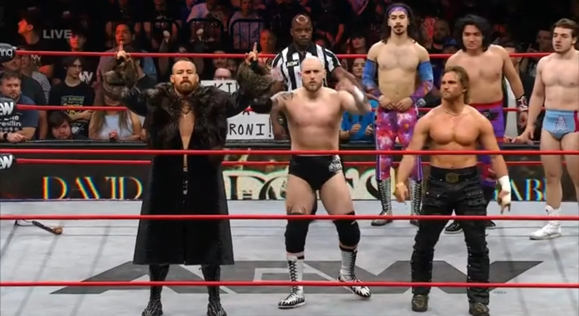 Otra lucha no anunciada, pero es el debut oficial de David Finlay, hijo de Fit Finlay, en el ring de AEW... El miércoles pasado, hizo su debut en AEW en general, atacando a Darby Allin y Orange Cassidy cuando estos vencieron a sus amigos del BULLET CLUB War Dogs... Tony Khan confirmó hace poco que los tres ya son All Elite y se llamarán solamente The Dogs... La lucha empezó con Gabe Kidd derribado a dos de sus oponentes, mientras Connors le hizo tremenda spear al otro... Finlay le hizo un powerbomb al hombre con el relevo legal y lo lanzó de un lado al otro con un tremendo súplex... Kidd decapitó al otro tipo con un lariat al cuello tremendo y Connors castigó con tremendo brainbuster para rematarlo... Luego, Kidd atacó a otro con el Gotch-style PIledriver y Finlay le puso su firma con un tremendo Overkill, seguido de un súplex vertical y tremendo rodillazo en la cara para rematarlo...