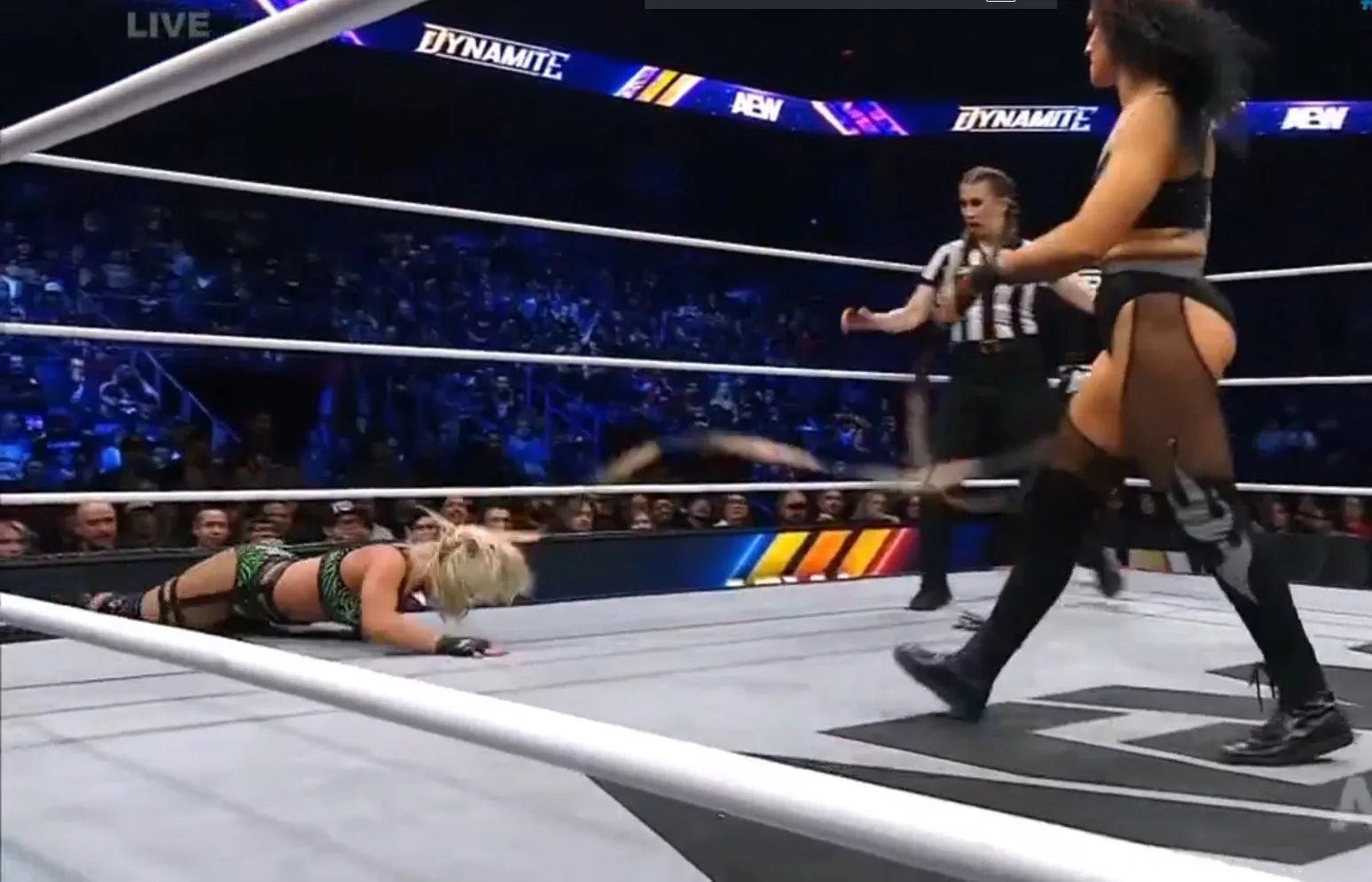 ► Toni Storm apareció entre la multitud y dijo que ya ha hecho las paces con las posibilidades de quedar calva, pero que, de todas maneras, quiere que Marina Shafir luzca como algo que vendieran en Spirit Halloween, y quiere raparla…