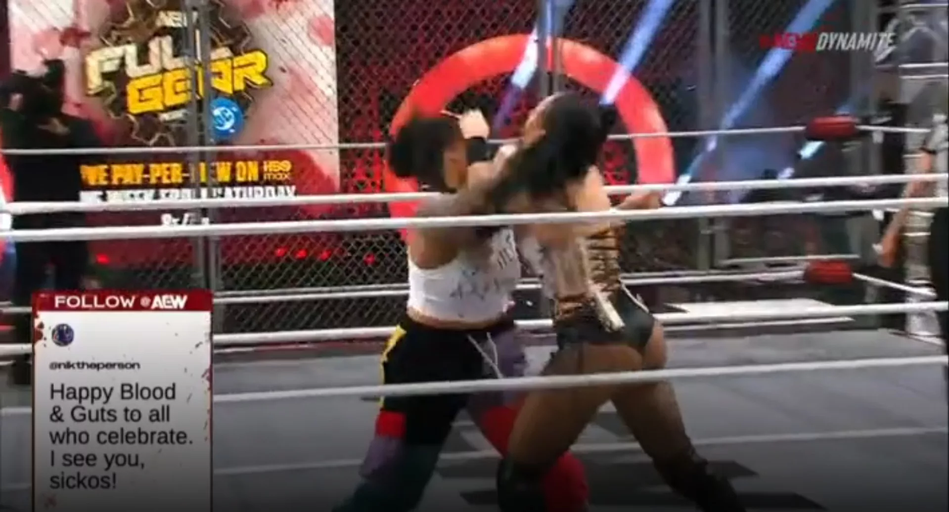 La noche abrió con la primera gran lucha, una lucha en doble jaula, la versión War Games de WWE, pero con la violencia y la espectacularidad y la calidad técnica de AEW, en donde en luchas especiales como estas, los gladiadores se exigen de más. Un luchador de cada equipo empezó la contienda, y luego, iban entrando poco a poco los luchadores con el paso de los minutos. Blue y Nightingale empezaron las acciones y rápidamente tomaron armas para darse con todo. Willow llegó a Skye contra el esquinero, le dio golpes con los antebrazos y la arrojó contra la lona, luego, la arrojó de cara contra una de las paredes de la jaula y Blue se abrió la frente y empezó a sangrar. Blue luego intentó un supléx y Julia Hart entró al ring para el combate y se unió con ella para castigar a Nightingale con un doble powerbomb. Harley Cameron fue la siguiente participante, entró al ring con una silla y atacó a Blue y Hart con fuerza. Nightingale dominó a Hart y Thekla fue la próxima participante, para que el Triangle of Madness pudiera estar completo. Llegó atacando con todo a Cameron y a Nightingale dándole hasta con su cinturón. Megan Bayne, acompañada de Penélope Ford, fue la próxima en entrar y atacó con un doble supléx a Hayter. Cameron le dio con una caneca de basura, pero no pasó nada. Queen Aminata apareció para evitar que Ford se metiera en la lucha. Cameron mandó a volar a Bayne y le cayó encima con una plancha cruzada. Luego, la 12 veces campeona, Mercedes Moné, apareció. Se fue directo contra Nightingale y aunque la golpeó, esta intentó una tombstone piledriver, sin embargo, Moné logró con una corbata mandar a volar a Statlander. Moné salió del ring y luego, metió al ring varios de sus campeonatos y se la dio a sus compañeras. Mina Shirakawa apareció con un bate lleno de alambre de púas. Se lo lanzó a Bayne, pero como distracción para darle unas tremendas patadas voladoras. Llegó el turno para Marina Shafir y también tuvo sus momentos, la última participante fue Toni Storm y allí oficialmente empezó la Blood and Guts, pues ya todas las participantes estaban en el ring. Se dieron de manera impresionante durante unos 20 minutos más. Toni Storm hizo sangrar a muchas de sus rivales, y hasta sacó vidrios reales rotos en el centro del ring y le hizo a Shafir un DDT durísimo, en conjunto con Mina.