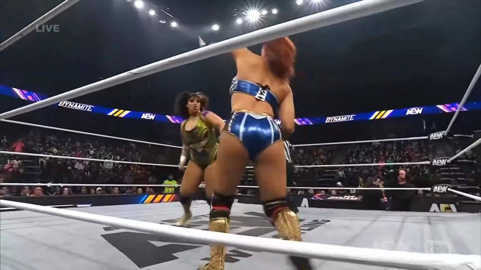 La hermosa y ruda Kamille hizo su sorprendente regreso a AEW en el PPV AEW Dynasty 2026, en donde atacó brutalmente a Willow Nightingale antes de que el show empezara, por lo que la dejó fuera de acción... Más tarde, Kamille logró una victoria rápida en menos de minuto y medio ante Big Anne en el Zero Hour de dicho PPV... Nightingale intentó entrar al ring, pese a las advertencias de los médicos, y terminó recibiendo otra paliza de Kamille, por lo que Nightingale decidió darle esta lucha titular a Kamille, aunque no sin advertirle que era totalmente letal cuando de tomar venganza se trataba... Curiosamente, Willow ya ha vencido a Hikaru Shida y Queen Aminata en sus luchas de regreso a AEW, y esta contra Kamille puede considerarse el regreso de Kamille... La campana sonó y Kamille se le fue encima con todo, pero Willow logró evitarla y le dio varios puñetazos en el esquinero, luego, la mandó contra otro esquinero y le remató la cabeza contra la protección del tensor en repetidas ocasiones... Kamille luego reaccionó castigando con un jalonazo el hombro de la Campeona TBS, y dándole una patadota al hombro izquierdo... Kamille con su hombro le lastimó el codo a Willow y luego le jaló de nuevo y duro el brazo izquierdo, se enfocó allí... Pero, Willow le dio una patadota en la cara... Ospreay luego reaccionó y atacó en el esquinero con machetazos a Kamille, y la azotó duro de cara contra la lona... Kamille arrojó duro contra el esquinero a Willow, luego, le hizo tremenda llave contra el esquinero... Kamille luego azotó el brazo izquierdo de Willow contra la ceja del ring y se burló... Willow luego sobrevivió a una cuenta en dos... Tras comerciales a doble pantalla, mejoró la calidad de la lucha... Kamille esquivó a Willow, luego, le dio un golpe en el pecho... Willow luego azotó a Kamille con una bala de cañón en el esquinero, pero la cuenta llegó solo a dos... Willow esquivó un golpe de Kamille en el esquinero, esta se golpeó de cara contra la protección del mismo, y Willow aprovechó para ganarle con una rodada a espaldas y retener el Campeonato Femenil TBS.