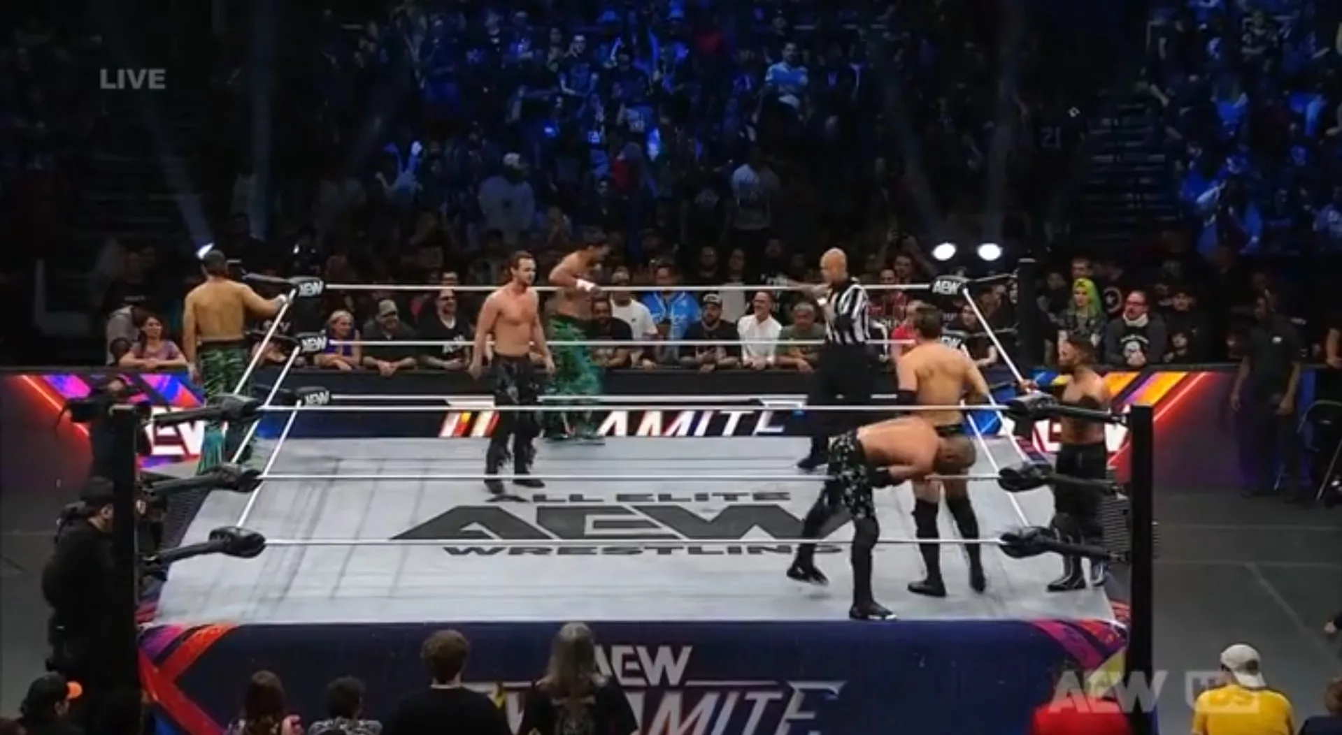 Okada empezó la lucha atacando a Perry, y rápidamenete quedó solo y siendo atacado por los Bucks y el Jungle... Más adelante, Romero saltód esde lo alto y le cayó pisando la espalda de Matt Jackson, pero Jack Perry salvó la situación... El dominio estuvo compartido entre los dos... en este punto, los villanos volvieron a sacar ventaja... Okada, Beretta y Romero buscaron martinetes al tiempo... pero Perry y los Jackson los mordieron en los genitales y así se liberaron... tremenda movida suicida... Romero recibió el BTE Trigger de los Young Bucks y Jack Perry le dio tremendo rodillazo al a cabeza, para que Matt Jackson simplemente lo cubriera y así obtener la cuenta de tres.