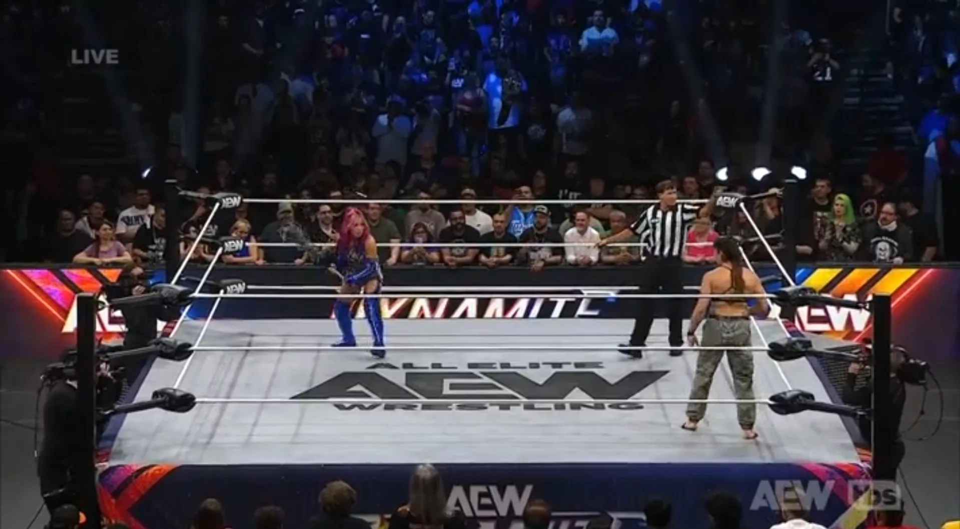 Continúa la rivalidad entre Toni Storm y Marina Shafir... Originalmente, Storm iba a luchar, pero fue brutalmente atacada tras bambalinas por alguien que no sabe quién fue, como una hora antes de este Dynamite... En Revolution, Storm logró vencerla en una dura batalla, pero, luego, Storm fue confrontada por Ronda Rousey, quien hizo su debut en AEW... Ya vermeos qué pasará con ella... Durante el caos del careo de Storm y Rousey y la seguridad, Shafir atacó con un golpe a traición a Storm y se fue con su gran amiga, Rousey, por entre el público... por eso, tenemos esta lucha de súper libre, entre Mina Shirakawa, gran amiga de Toni y quien entró en su reemplazo, y Marina Shafir... la campana sonó y Mina le dio dos batazos con alambre de púas al abdomen a Marina, esta le dio rodillazos al abdomen y la azotó contra la lona... Mina luego logró arrojar a la lona a Marina y le dio varias patadas poderosas en la espalda... Mina sacó una btolleta de champagne debajo del ring, pero Marina le patéo la mano y no pudo usarla... Marina le hizo un azotón de espaldas contra la lona a Mina... Mina luego cogió a silletazos a Marina, quien reaccionó arrojándola hacia fuerad el ring y rompiendo una mesa... La cuenta llegó solo a dos a favor de Marina... Y, al poco tiempo, la japonesa Mina Shirakawa logró vencer a la estadounidense, Marina Shafir, tras su codazo giratorio y rematarla con tremendo powerbomb.