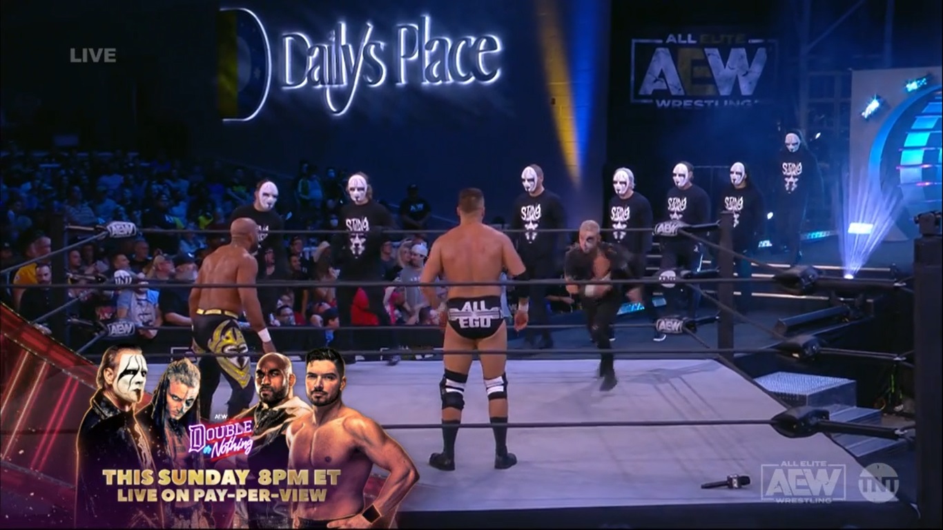 ► Tras la lucha, Page y Sky iban a hablar mal de Sting y Darby Allin, pero estos aparecieron con un montón de personas con máscara de Sting y se vengaron de la paliza previamente recibida en el show.