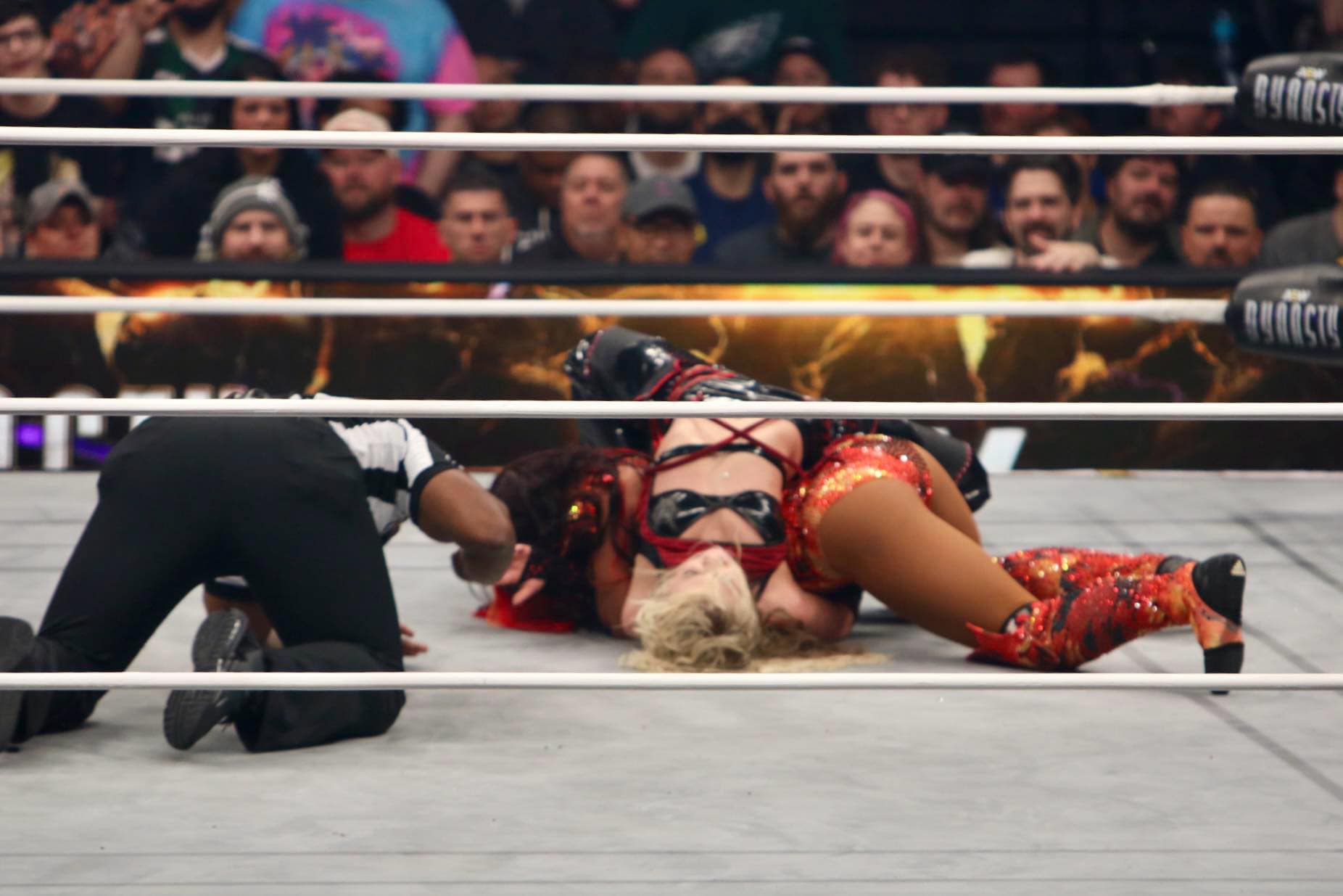 Moné reaccionó con una meteora desde la ceja del ring sobre Hart, la devolvió al cuadrilátero y fue por la cuenta, pero Hart resistió. Moné le aplicó un azotón contra la lona a Hart y la mantuvo controlada con una llave de rendición.