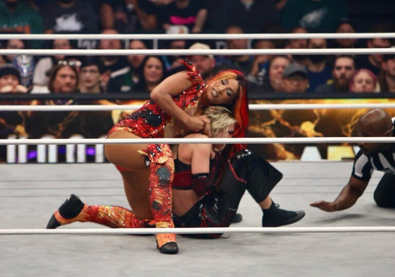 Luego llevó a Moné de regreso al encordado, la estrelló contra la lona y buscó la cuenta, pero Moné volvió a resistir. Hart intentó conectar un moonsault desde la tercera cuerda, pero Moné la recibió con las botas hacia arriba y le aplicó un par de quebradoras de espaldas.