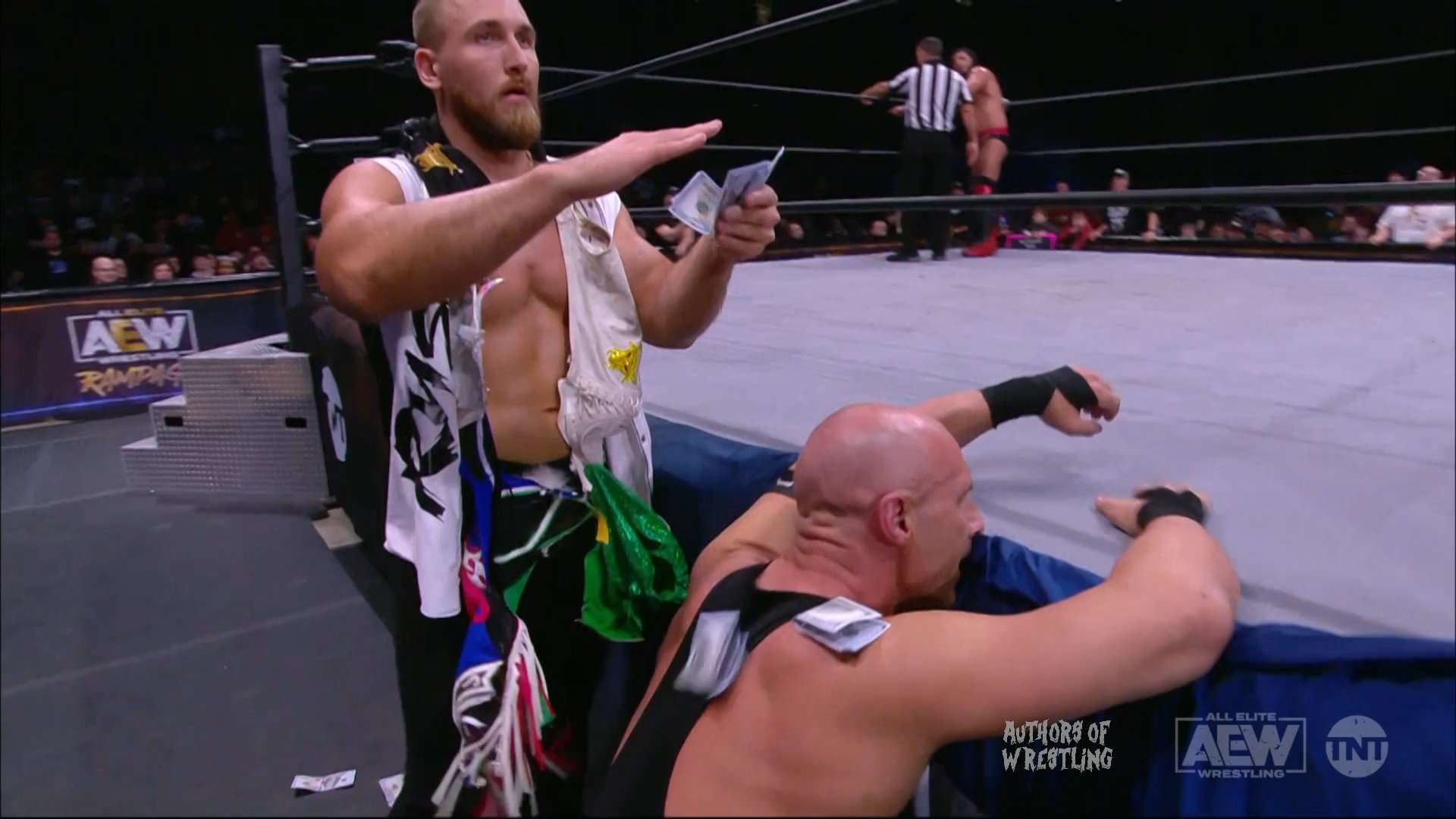 Swerve y compañía continuaron castigando a Pillman tras el combate, pero Dustin Rhodes apareció para salvarlo.