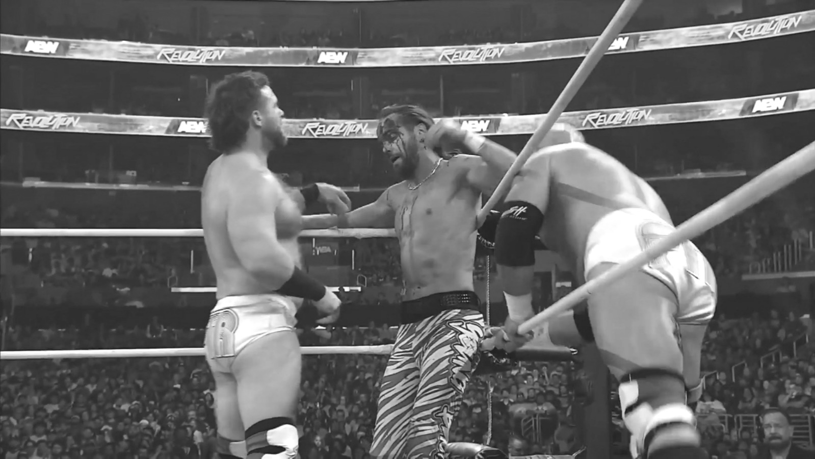 El enfrentamiento comenzó con una intensidad absoluta cuando Matt y Dax intercambiaron bofetadas y derechazos en el centro del ring. Los Young Bucks tomaron la iniciativa temprana con una superpatada de Matt y un suplex alemán asistido sobre Dax. La acción se trasladó rápidamente a los exteriores, donde Nick intentó un lance pero terminó estrellado contra la mesa de comentaristas. La brutalidad aumentó cuando FTR ejecutó un martinete contra el borde del ring, lo que provocó que Nick Jackson comenzara a sangrar profusamente. Dax también resultó herido y ambos equipos lucharon bañados en sangre. Cash impidió el relevo de los Bucks con una Gory Bomb sobre la ceja del cuadrilátero, manteniendo el control para FTR. Sin embargo, Nick logró reaccionar con una combinación de dropkick y sentón, permitiendo finalmente la entrada de Matt. El caos continuó fuera del ring cuando Malachi, desde la zona del público, lanzó refresco a los ojos de Dax tras una provocación, lo que provocó un choque accidental entre los miembros de FTR. En los momentos finales, el drama alcanzó su punto máximo. Los Bucks aplicaron francotiradores simultáneos, pero FTR resistió y respondió con un powerbomb y una combinación de suplexes hacia el suelo firme. Tras varios conteos de dos que dejaron al público atónito, incluyendo un Shatter Machine y un BTE Trigger, la resistencia de ambos bandos pareció sobrehumana. Finalmente, Wheeler logró interferir en las cuerdas y FTR sentenció el combate con un Shatter Machine desde la tercera cuerda para llevarse la victoria por cuenta de tres.