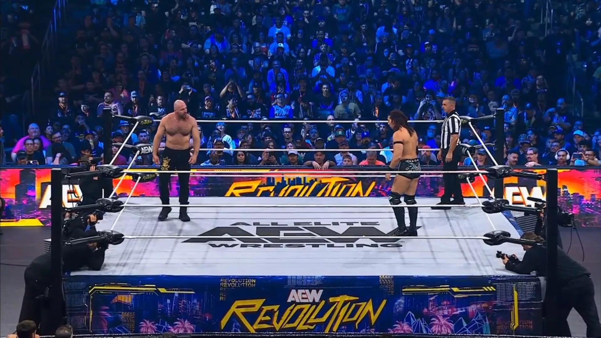 Después, la lucha incrementó su intensidad; ambos empezaron a cansarse un poco... Mox pisoteó los dedos de Takeshita, este evitó un pisotón en la cabeza y le dio un derechazo a Mox, pero este le pisoteó la pierna y ahí sí le pisoteó la cabeza contra la ceja del encordado.
