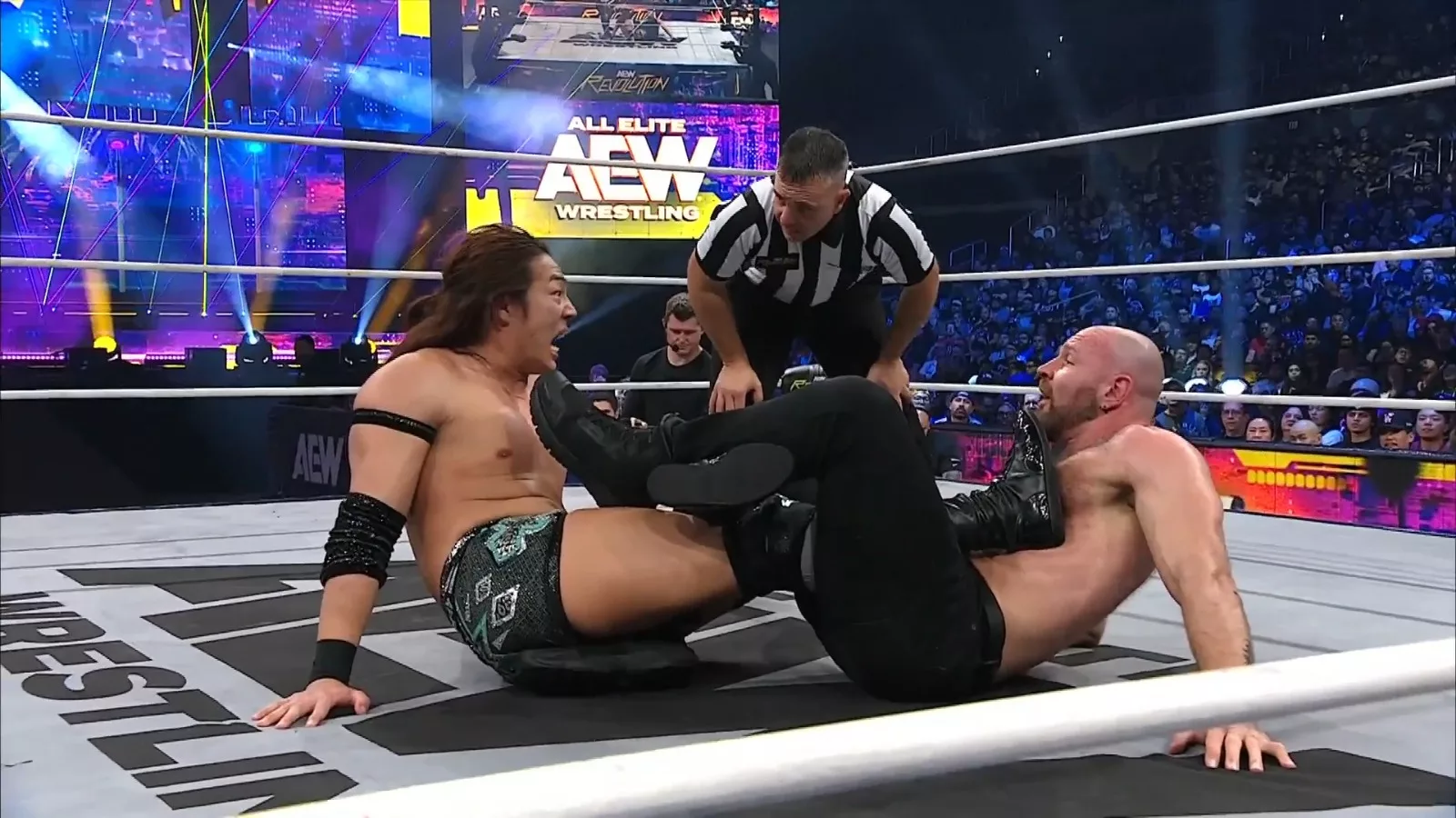 Mox luego atacó con varios súplex a Takeshita, más de cuatro seguidos; luego, hubo un intercambio de lazos al cuello y Takeshita casi gana por cuenta de tres.