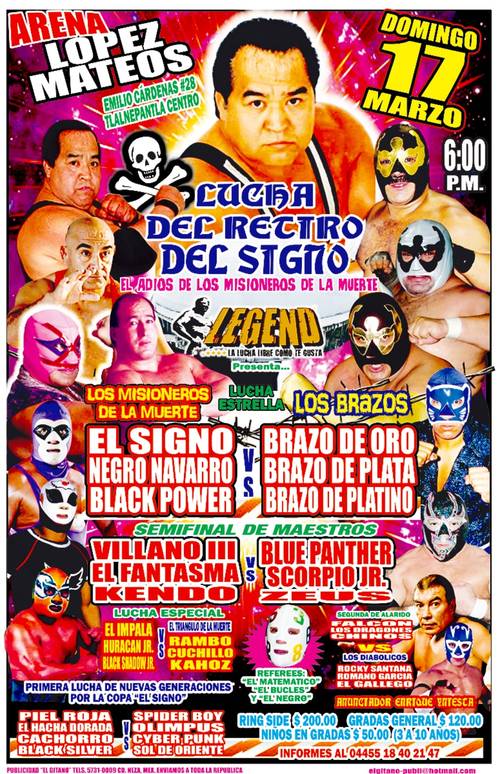 El Signo, una de las más grandes figuras de la lucha libre, se retirará con una gran función desde la Arena López Mateos el próximo domingo 17 de marzo sobre las 6:00 PM, enfrentando en en compañía de Negro Navarro y Black Power, Los Misioneros de la Muerte, a Los Brazos: Brazo de Oro, Brazo de Plata y Brazo de Platino.
