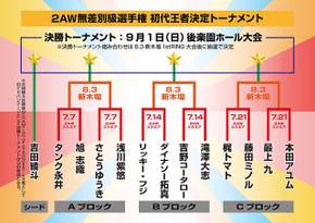 6. 2AW Openweight Title First Champion Tournament – Round 1: Yuki Sato derrotó a Shu Asakawa (10:16) con un Jikiden Tornado Clutch.