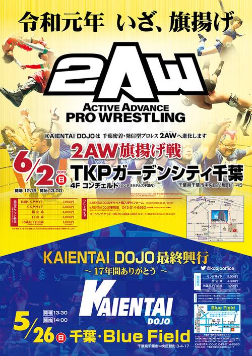 Tras 17 años bajo el nombre de KAIENTAI DOJO, la antigua liga de TAKA Michinoku organizó el primer evento con su nuevo nombre: Active Advance Pro-Wrestling (2AW).