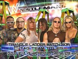 En la historia de WrestleMania han habido múltiples luchas por el Campeonato en Parejas, ya sea por el Campeonato del Mundo o el Campeonato de la WWE. Pero ninguna como los dos combates que sostuvieron estas tres parejas en los WrestleManias 16 y 17, Edge & Christian, The Hardy Boyz (Matt & Jeff Hardy) y The Dudley Boyz (Bubba Ray & D-Von Dudley) donde las escaleras, fueron
