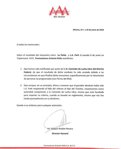 Que hemos sido notificados por la H. Comisión de lucha libre del Distrito Federal, de que el resultado de dicho combate ha sido anulado debido a las circunstancias en que finalizo dicho encuentro; específicamente por la intromisión de personas no programadas (los perros del mal).Anuncio Que aunque, en un principio, dimos a conocer el ganador absoluto había sido LA Park respetando el fallo del referee el hijo del tirantes, reconocemos como autoridad competente a la comisión de lucha libre, misma que está facultada para imponer su criterio, cuando es basado en reglamento, mismo que nos fue citado puntualmente en su dictamen.Quedo a sus órdenes para cualquier aclaración.