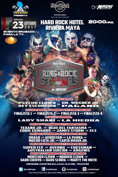 La Gira del 25 Aniversario AAA sigue su curso y en esta ocasión, bajo el patrocinio de Magnicharters, Triple A World Wide presenta: Ring & Rock StAAArs 2017 a celebrarse en el Hard Rock Hotel Riviera Maya el 23 de septiembre venidero.