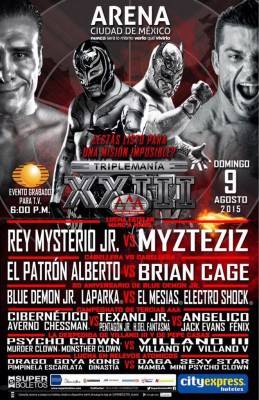 PAPSA presenta: Triplemania XXIII desde la Arena ciudad de México; show transmitido en vivo por iPPV. Como atracción principal tendremos la lucha de ensueño: Rey Mysterio vs Myztezyz CARTEL COMPLETO: Lucha de Ensueño: Rey Mysterio vs Myzteziz Cabellera vs Cabellera: El Patrón Alberto vs Brian Cage. Adiós a Villano III, lucha de tercias: Villano III, Villano