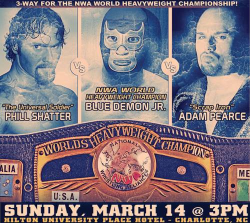 Adam Pearce recuperó de manos de Blue Demon Jr. el título NWA Heavyweight esta noche, 14 de marzo de 2010, en Charlotte, North Carolina, durante un match de 3 esquinas que incluyó al veterano de Iraq y poseedor del NWA National Champion, «Universal Soldier» Phill Shatter.