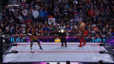 Los ex Campeones Mundiales de Parejas AEW, Big Bill y Ricky Starks, tienen que enfrentarse a los Top Flight si quieren volver a estar cerca de tener una oportunidad por el título. Esta es una lucha de cuartos de final del torneo y ahora, el equipo que ganara aquí, se debe enfrentar a FTR, que ganaron previamente esta noche. Ricky y Darius comenzaron la lucha. Ricky intentó una proyección de cadera, pero fue bloqueado por Darius, quien envió a Ricky al suelo. Darius tuvo a Ricky en una llave al brazo. Ricky logró liberarse mientras Darius derribaba a Ricky con un arm drag. Dante entró al ring y cubrió a Starks, pero solo consiguió una cuenta de dos. Big Bill recibió el relevo. Dante le dio raquetazos a Bill en la esquina, quien estaba enojado. Bill agarró a Dante y luego le dio raquetazos enérgicos en la esquina. Bill envió a Dante a las cuerdas. Top Flight hizo una doble patada voladora a Bill, enviándolo al suelo. Ricky entró, pero recibió una doble patada voladora de Top Flight. Starks fue enviado al suelo. Bill entró pero recibió un gran rodillazo de Dante. Dante corrió por las cuerdas, pero Starks lo tropezó y Bill le dio un gran botazo en la cara. Pasamos a los comerciales a pantalla dividida. Starks levantó a Dante y lo estrelló contra el suelo. Starks tuvo a Dante en un candado a la cabeza con sus piernas. Starks envió a Dante a la esquina y etiquetó a Bill. Dante estaba en el suelo en la esquina de los rudos. Bill envió a Dante a la esquina y luego lo golpeó mientras caía al suelo. Bill luego levantó a Dante y lo envió cabeza primero al poste del ring.<br />