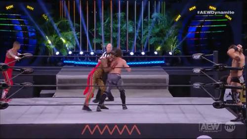 Los Private Party lucen algo nerviosos pese a que ya han pasado 3 minutos del combate. Es su primera realmente gran lucha. Los luchadores están bastante ruidosos, y fueron sorprendidos cuando Private Party tiraron a Kenny y Adam Page contra ellos. Y luego cuando con un Sprinboard Dive, Isiah Kassidy se lanzó sobre Page para caerle encima a todo el mundo, en donde ninguno tiene cubrebocas para el novel coronavirus y la nueva covid-19.
