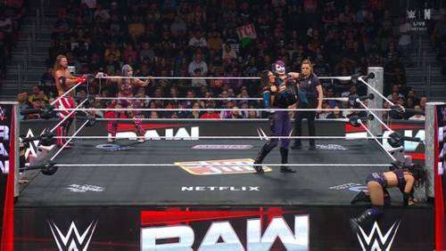 Pese al dominio inicial, The Judgment Day se repuso. Raquel frenó en seco a Kairi en pleno vuelo, permitiendo que Roxanne tomara el relevo y castigara con fuerza a la japonesa. Juntas, aplicaron una combinación de big boot y Russian Leg Sweep, que casi termina en la cuenta de tres. La ofensiva continuó con castigos en el ringside, incluyendo un moonsault de Perez tras un suplex de Raquel.
