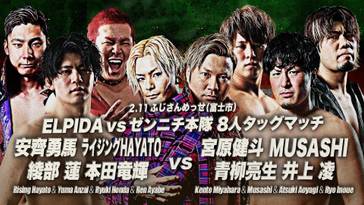 6. Zennichi Hontai vs. ELPIDA: Kento Miyahara, MUSASHI, Atsuki Aoyagi y Ryo Inoue vencieron a Rising HAYATO, Yuma Anzai, Ryuki Honda y Ren Ayabe (20:35) con un Shutdown Suplex Hold de Miyahara sobre Honda