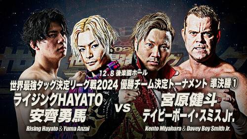 En la primera semifinal, Kento Miyahara y Davey Boy Smith Jr. dominaron a Rising HAYATO y Yuma Anzai de ELPIDA.