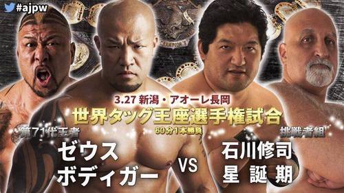 En la estelar, Zeus y The Bodyguard lograron la segunda defensa exitosa del Campeonato AJPW World Tag Team superando al equipo de Shuji Ishikawa y Hoshitango de DDT.