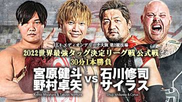 8. Real World Tag League: Kento Miyahara y Takuya Nomura [6] vencieron a Shuji Ishikawa y Cyrus [6] (17:36) con un Diving Rolling Clutch Hold de Nomura sobre Cyrus.
