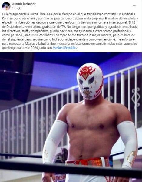 «Quiero expresar mi agradecimiento a Lucha Libre AAA por el tiempo en el que trabajé bajo contrato, especialmente a Konnan por creer en mí y brindarme la oportunidad de trabajar en la empresa. Mi decisión de dejar la compañía y solicitar mi liberación se debe a mi deseo de enfocar mi tiempo en mi carrera internacional.