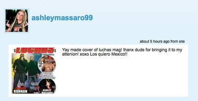 La ex-Diva Ashley Massaro presume en su Twitter, que ha aparecido en la portada de Súper Luchas 337, publicada esta semana: Yay made cover of luchas mag! thanx dude for bringing it to my attenion! xoxo Los quiero Mexico!! Twitter @ashleymassaro99 Twitter @superluchas Gracias al compañero Gera por el aviso