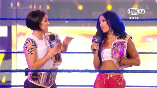 Ahora Las campeonas de Parejas, Sasha Banks y Bayley, aparecen en el ring con micrófono en mano.