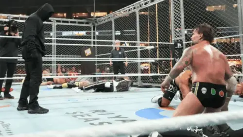 Cuando todo estaba por decidirse entre CM Punk y Bron Breakker, un individuo encapuchado y con pasamontañas entró en escena y defenestró al actual Campeón Mundial de Peso Completo WWE vía Superkick y Stomp, para seguidamente marcharse. Punk quedó así a merced de Breakker, que le endosó una Spear y lo cubrió, permitiendo que el quinteto rudo saliera victorioso.