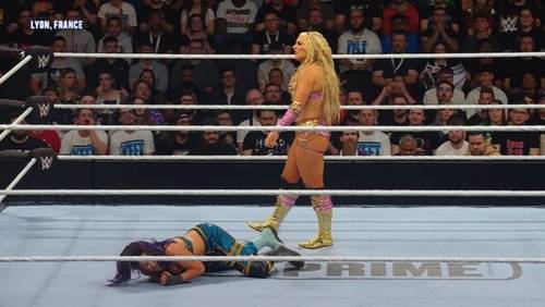 Pero Tiffy siguió con todo, azotando en las mesas de comentaristas a ambas; sin embargo, cuando intentó un mortal, Bayley y Naomi se quitaron y con una movida doble, le acomodaron un rompecaras.