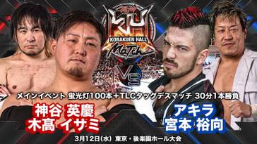 En el evento principal, como preludio al duelo por el Campeonato de Peso Completo Deathmatch BJW del 29 de marzo, Hideyoshi Kamitani e Isami Kodaka se enfrentaron a AKIRA y Yuko Miyamoto Hiromu en un comabte donde se usaron 100 lámparas de tubo, además de mesas, sillas y escaleras. El combate comenzó con Akira y Miyamoto atacando con fiereza a sus rivales, estos respondieron con las misma intensidad y al final AKIRA doblegó a Isami con un Western Death Bomb sobre una silla metálica. Tras el encuentro, AKIRA encaró a Kamitani volviendo a manifestar su interés por el campeonato deathmatch de BJW.