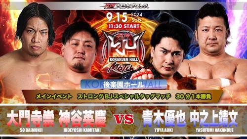 6. Strong BJ Special Tag Match: Hideyoshi Kamitani y So Daimonji vencieron a Yuya Aoki y Yasufumi Nakanoue (18:45) con un Backdrop Suplex de Kaconani sobre Aoki.