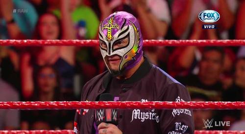 Rey Mysterio llega al ring con un equipo inspirado en The Phantom. Dice que ésta será su noche, y todo es gracias a su hijo Dominik, quien está sentado en ringside.