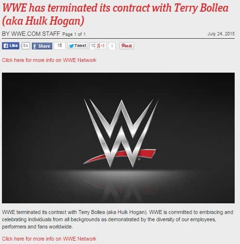 Por sus comentarios, al hasta ahora miembro del Salón de la Fama de WWE, le ha sido retirada toda referencia en la página oficial de WWE, ha sido removido como juez en el show Tough Enough, retirado del roster de WWE 2K16, entre otras acciones que la empresa del deporte espectáculo ha tomado hasta el momento.