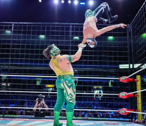 Poco a poco, la jaula se fue vaciando entre lances desesperados y huidas agónicas, hasta que el destino dejó frente a frente a Calavera Jr. I y Robin. En ese punto, la lucha se transformó en un duelo de resistencia y colmillo. El integrante de la dinastía Alvarado impuso experiencia con castigos a ras de lona y llaves que pusieron al límite a su rival, mientras el público reaccionaba con cada intento de rendición.