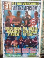 Por Miguel Rosales Les comparto el cartel del 61 aniversario de la Arena Afición, que estará llena de muchas estrellas del CMLL, incluyendo una lucha estelar que anuncia: Marco Corleone, Máximo y Rush vs Mr. Niebla, Negro Casas y Felino