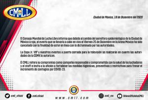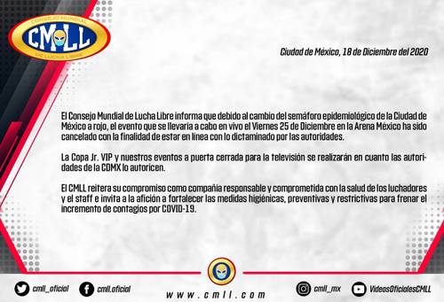 El CMLL anunció que no realizará su función navideña, pese a que ésta se realizaría a puerta cerrada en la Arena México. En esta, se disputarían dos campeonatos y la Copa Jr.