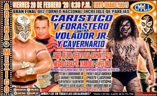 En la gran final del Torneo Nacional de Parejas Increíbles, Carístico y Forastero chocaron contra Bárbaro Cavernario y Volador Jr. Desde la caída inicial, las duplas se fueron con todo, pero Carístico y Forastero aprovecharon oportunamente los errores de sus adversarios para adjudicarse la caída.