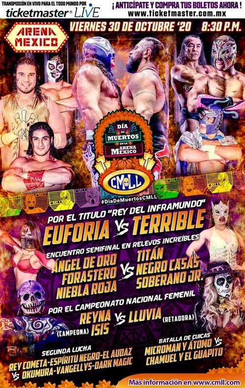 Cerrando el mes de octubre, el CMLL presentará su gran función «Día de Muertos en la Arena México«, con el que conmemora esta fecha tan especial. El evento podrá verse a través de Ticketmaster Live.