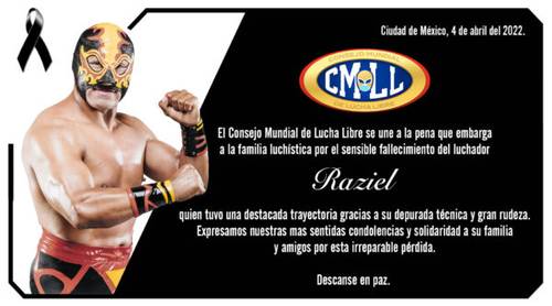 «El CMLL se une a la pena que embarga a la familia luchística por el sensible fallecimiento del luchador Raziel, quien tuvo una destacada trayectoria gracias a su depurada técnica y gran rudeza.