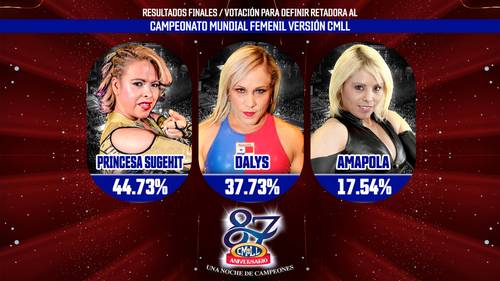 La terna por el Campeonato Mundial Femenil de CMLL fue una de las más reñidas, dada la calidad de las aspirantes a retar a la monarca Marcela. Amapola, Dalys y Princesa Sugey fueron la tercia que contendió en las votaciones. En los primeros días, las preferencias iban a favor de la Caribeña, pero poco a poco, la regiomontana fue remontando hasta dar la vuelta. En los últimos días, los aficionados de Sugey se volcaron e apoyarla, quedando en primer sitio con 7% arriba de su más cercana perseguidora.