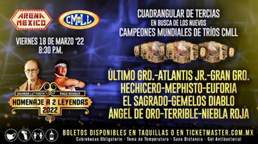 El Campeonato Mundial de Tercias del CMLL está por tener nuevos dueños. Será en Homenaje a Dos Leyendas cuando cuatro tercias busquen quedarse con los cetros.