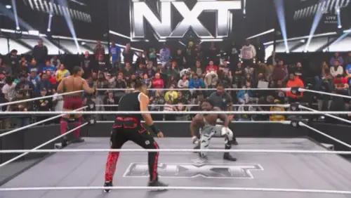 Osiris Griffin y Saquon Shugars, acompañados por Cutler James, pusieron en juego el Campeonato de Parejas de NXT ante los retadores de OTM: Bronco Nima y Lucien Price. Desde el inicio, la lucha mostró un ritmo físico y constantes relevos.
